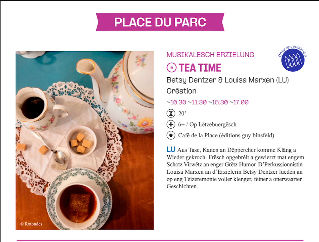 Together with Louisa Marxen, I invited to 4 different tea times: the audience was invited to write down words with whom we then improvised stories, both verbally and musically. It was a pleasure to be part of this event again after a few year’s break.